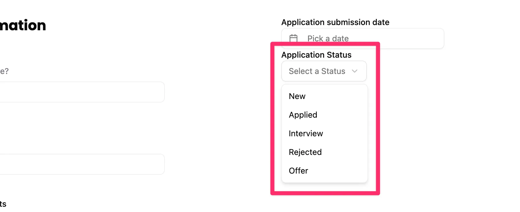<Popover> <PopoverTrigger asChild> <Button variant={"outline"} className={cn( "w-[280px] justify-start text-left font-normal", !date && "text-muted-foreground" )} > <CalendarIcon className="mr-2 h-4 w-4" /> {date ? format(date, "PPP") : <span>Pick a date</span>} </Button> </PopoverTrigger> <PopoverContent className="w-auto p-0"> <Calendar mode="single" selected={date} onSelect={setDate} initialFocus /> </PopoverContent> </Popover> <input type="hidden" name={name} value={date ? date.toISOString() : ""} /> </> )}Moving on to the next box, we have the Application Status: